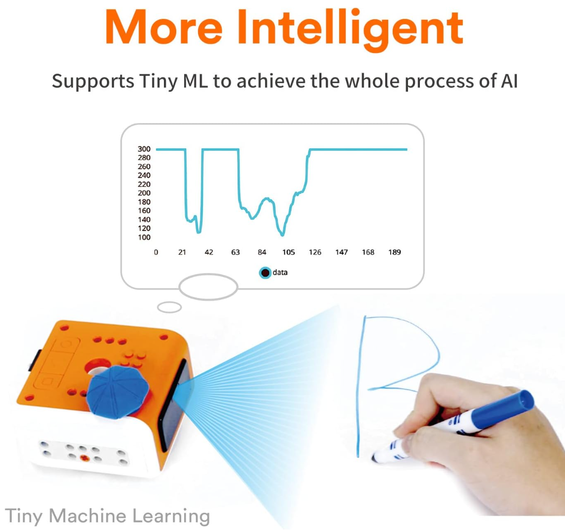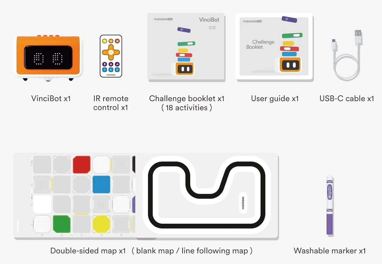 8 sensorlu interaktiv səs, işıq və hərəkət effektləri, 21 musiqi aləti səsi, LED matrisi, patentli RGB LED işıq quruluşu və dəqiq çizim kimi xüsusiyyətləri sayəsində çoxşaxəli öyrənmə imkanı təmin edir. VinciBot həm qrafik proqramlaşdırmanı, həm də Python-u dəstəkləyir.